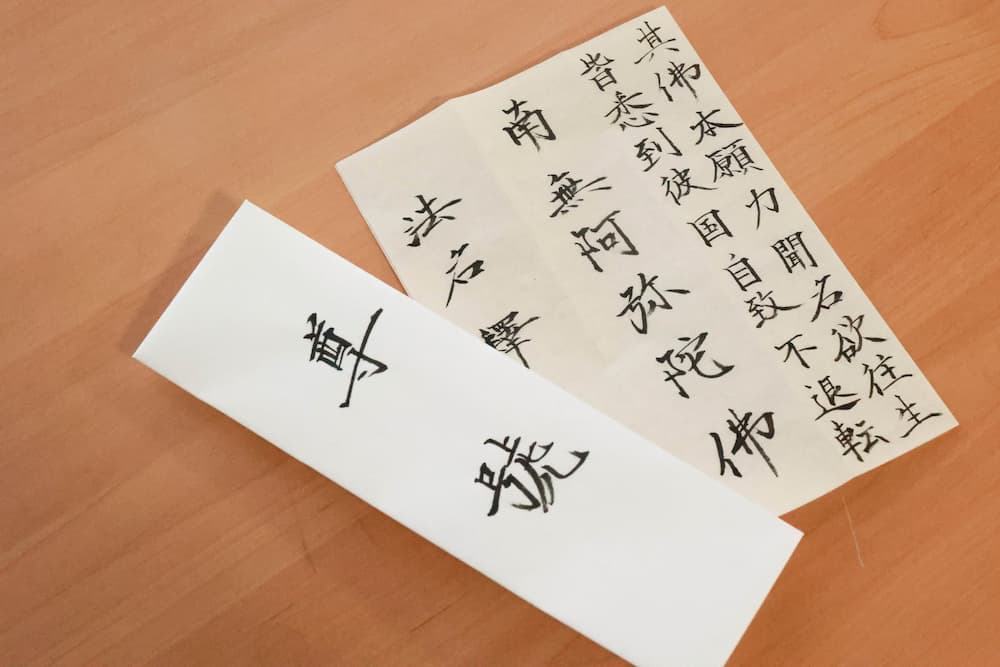 葬儀のお勤めが始まる前、棺の蓋の上をよく見てみてください。そこには「南無阿弥陀仏」と書かれた六字名号があるはずです。これは「納棺尊号」というもので、出棺時や火葬場など本尊を安置することが難しい場面において、本尊の代わりとして用いるものです。お寺によってその様式は位牌であったり、紙であったり、垂れ幕であったりと様々ですが、大きさ・形に関わらず、その意味は本尊と全く同じです。