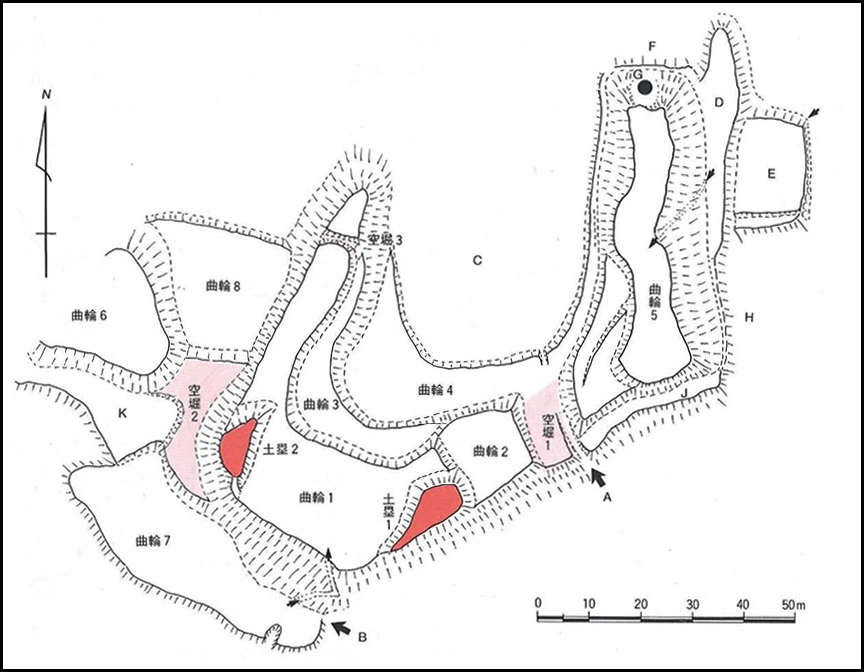 資料には城の主郭は曲輪1にあったと記述がある。そこから城は南を正面にして向いていたと考えられるため、念仏洞は城の裏側、しかもかなり目立たない場所に造られたということになる。