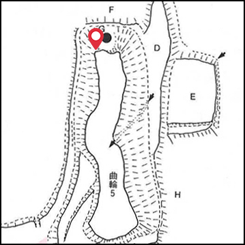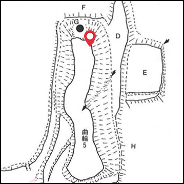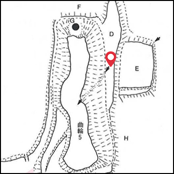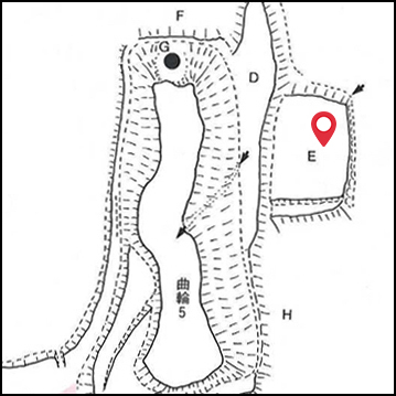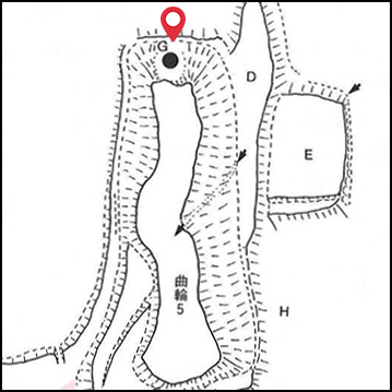 当念仏洞の情報は『姶良町中世城館跡』(鹿児島県姶良町教育委員会 平成6年)に右の地図と併せて掲載されているものである。なお念仏洞の場所はG地点になる。