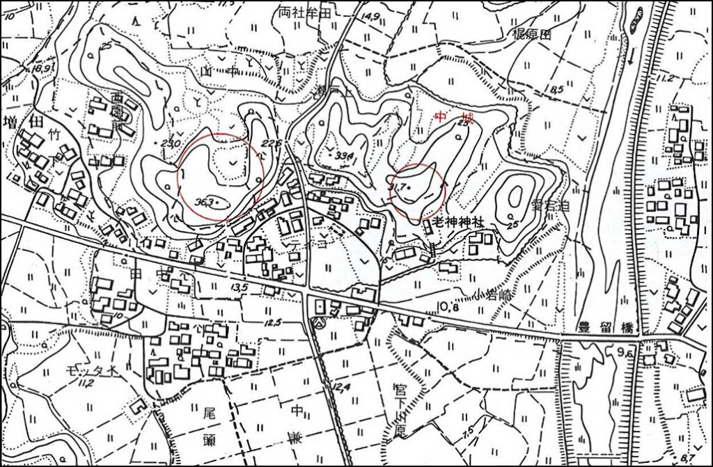 もう一つ、同書より地図を引用する。 ※左の赤丸が念仏洞跡のある小山である。