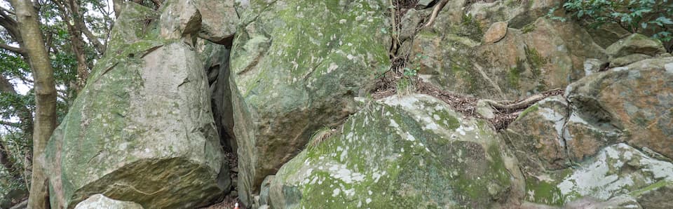 岩場は山の頂上付近(標高約90m)にあり、民家からは隔絶された場所にある。