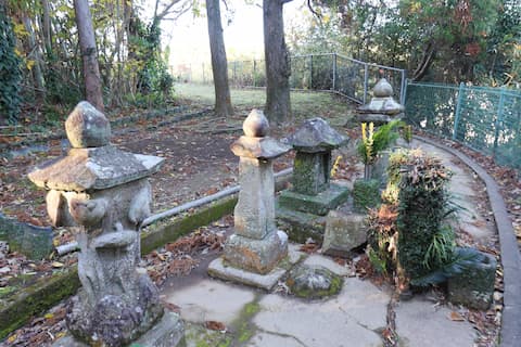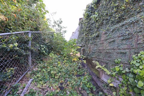 「頂上より少し下がった所に東向きに入り口」とあることから、水天殿の石塔があるフェンス側から入口があったと思われる西側(擁壁方向)の下方に向けて撮影した。