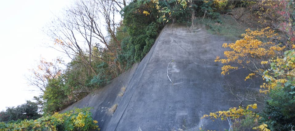 上の写真のピンの位置から西に向かって見える擁壁上部が該当場所。