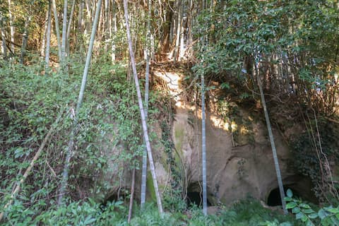 崖下に掘られた3つの洞窟が等間隔に並んでいた。