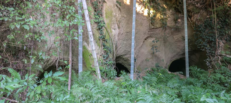 崖下に掘られた3つの洞窟が等間隔に並んでいた。