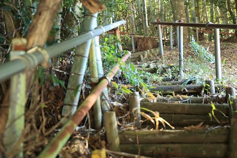 所どころ足場の竹が割れていたり、消失している箇所もあるが、鉄パイプの手すりが備え付けられているので歩行は容易。