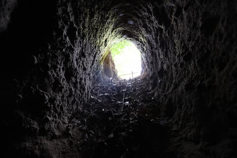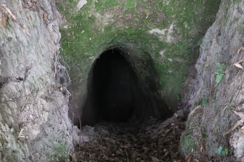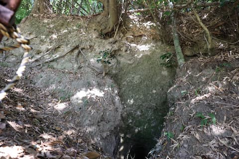 更に本名の西貞助宅後方に当たる洞穴は、西園半次郎らが掘ったものであり、内部の構造はよほど巧みで入口は北に五尺ほど入って左に五、六尺進み、更に右に曲がって一間入った所で又右に向かって作られている。長さ一丈二尺(約四メートル)、幅七尺(二メートル余)、高さ五尺五寸(約一・七メートル)の洞穴である。この中で炭火を用いた形跡がある。なおこの穴を掘るとき使用した鍬の跡が明瞭に付いている軽石と、炭と瀬戸物の破片を発見した。