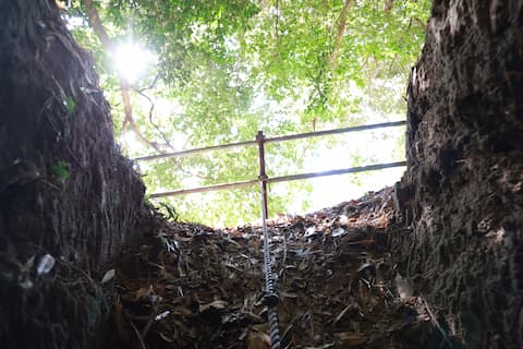手すりの上段しか見えないことからも相当な深さであることが分かる。 これだけ深いと、もっと土砂や落ち葉が流れ込みそうなものだが、実際に入ってみると意外にも綺麗だった。おそらく定期的に掃除がされているようだ。