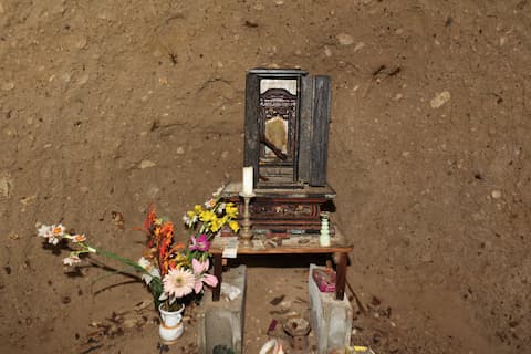 一般的な念仏洞と同じく、内部の光が外に漏れないようにするための「入口部分が高い構造」である。