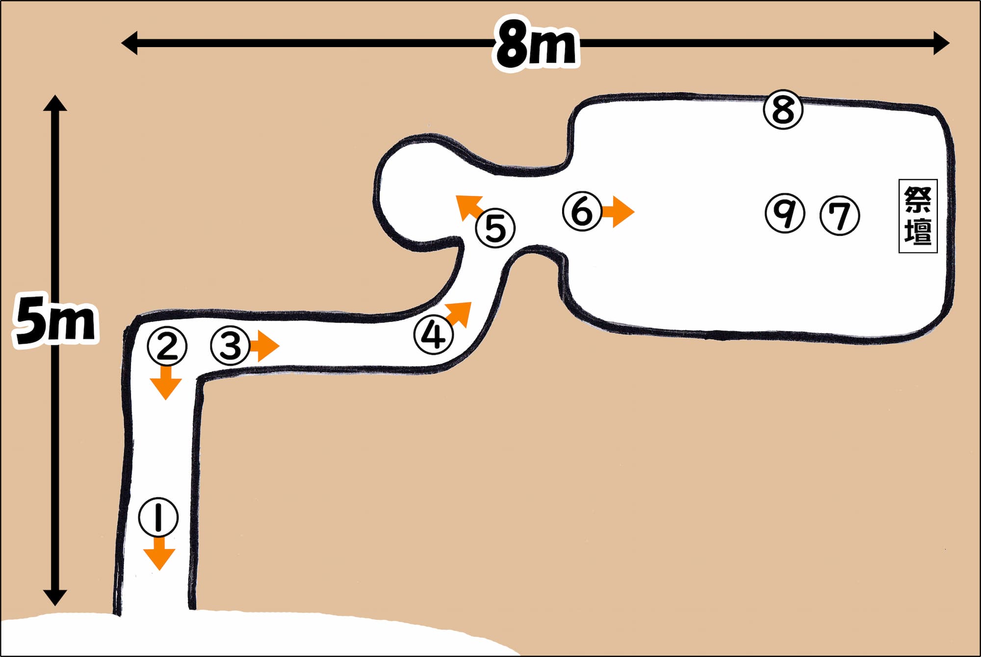 ▲洞窟内を上から見た図(番号は撮影位置、矢印はカメラの向き)