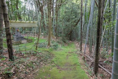 2分ほど林道を歩くと、右側の竹林の中にポツンと一基だけ墓が見えてくる。陶製の歌舞伎人形を目印に竹林の中へと入っていく。