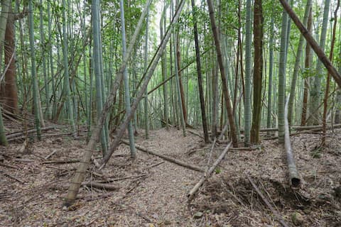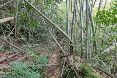 竹をくぐったり、跨いだりしながら、さらに坂を下りていく。