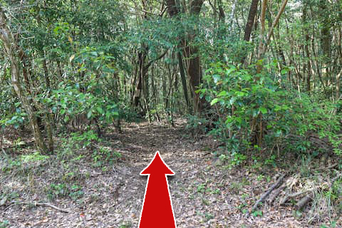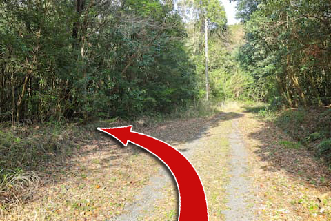 舗装された道が切れた先に道が一部広くなっている箇所が現れるので、そこから左の林に入る。