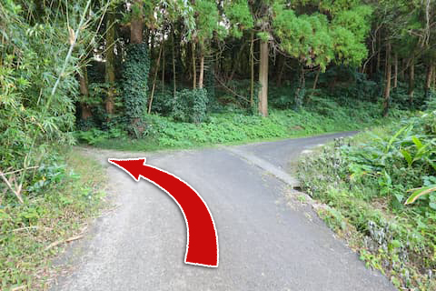 県道17号線との交差点から県道28号線を指宿市街地方面へ向けて220m進み左折。坂を200mほど上がった先にある左の脇道へと入る。