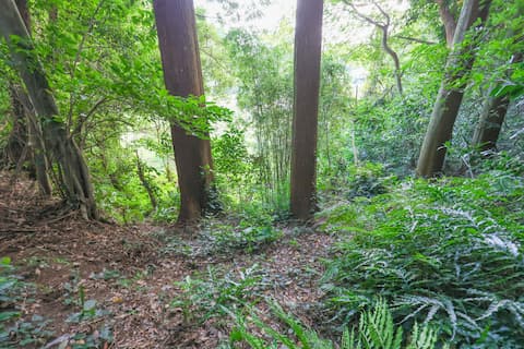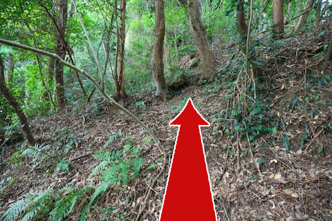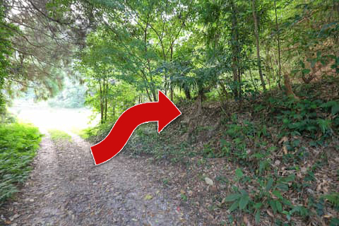 目的地へ行くためにはその手前の土手を上がり、林の中へと入っていく。