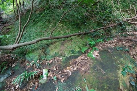 一面が緑で見つけにくいが、岩の正面に置かれた花入れを目印すると、その存在を確認することができる。