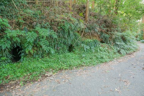ちなみに摩崖仏へと続く脇道へと入らずにそのまま坂を150mほど直進すると道路沿いの土手に等間隔で並んだ横穴が存在する。
