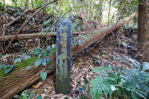 草木と格闘しながらしばらく歩くと、左手の土手下に目当ての石碑を発見。