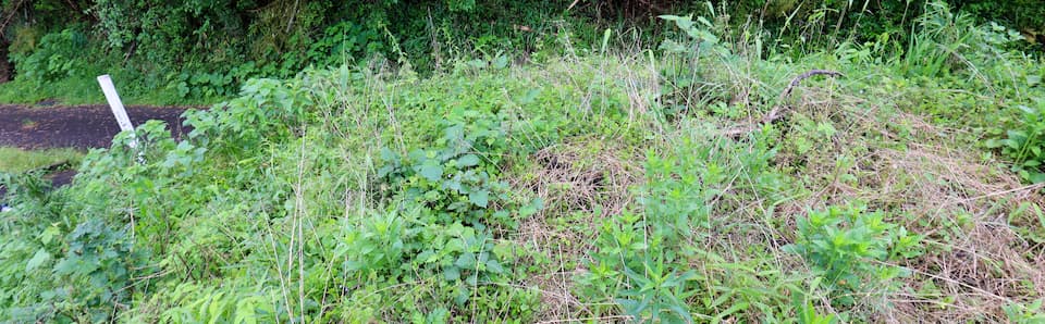 道路脇の標柱の場所がそのまま目的地。標柱上部の矢印は隣の土手を指しているので、この土手が念仏洞跡なのだろう。