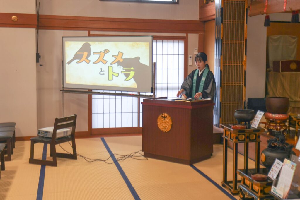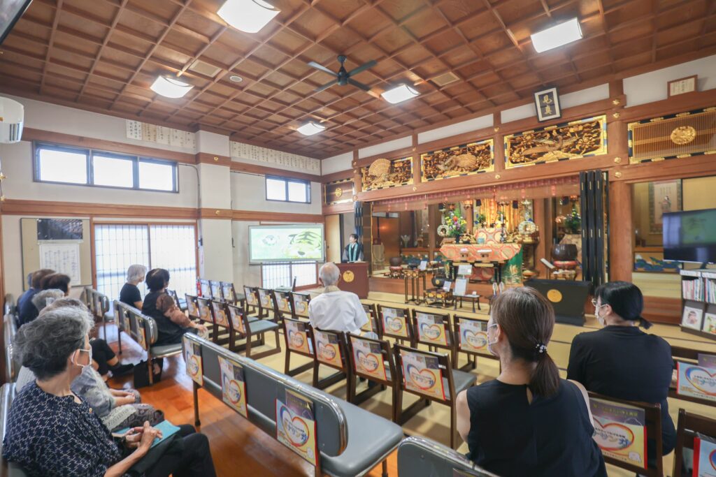 今回は20・22日を正道(住職)、21日を美穂、23日を裕道が法話を担当しましたが、美穂は今回が初法話。プロジェクターを使った紙芝居調の法話を披露したところ、最後に皆さまから応援の意味も兼ねて温かい拍手が送られました。これを励みにさらに精進していくことでしょう。